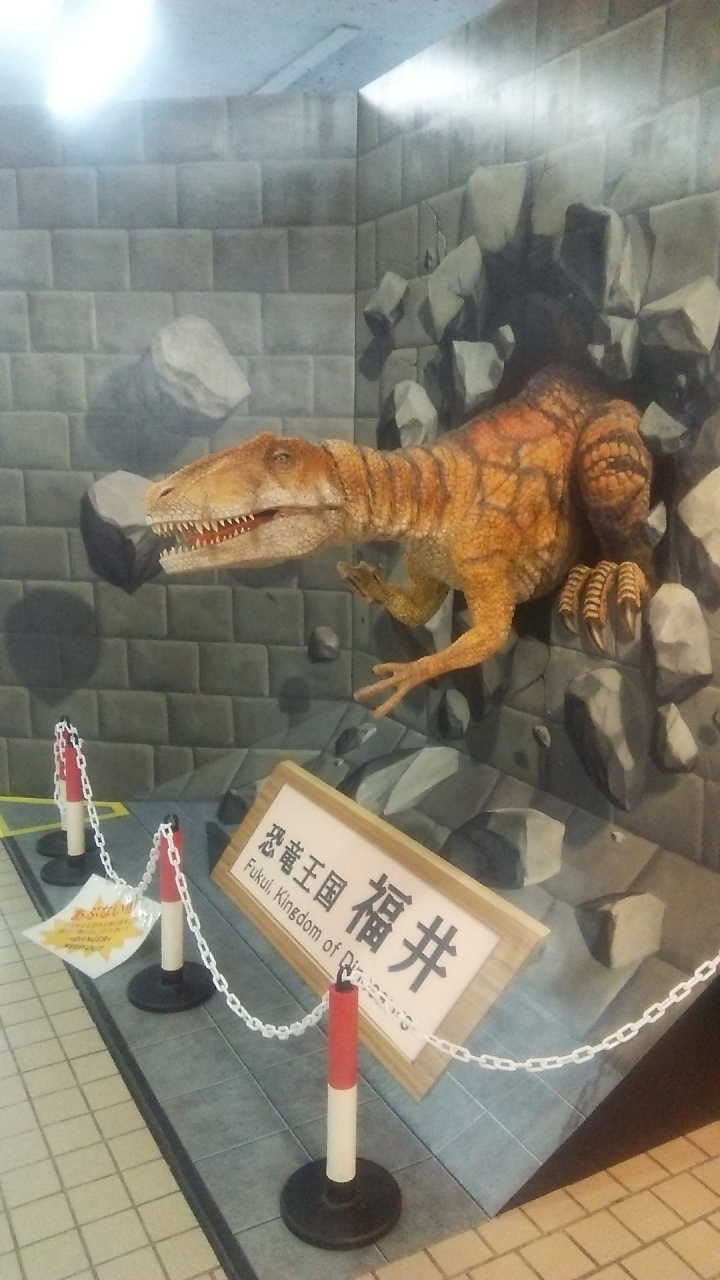 荷物を受け取って出ると、恐竜王国福井の看板と恐竜のロボットがお出迎え。その脇をぬけるとすぐ外で、小松駅行きバスと金沢駅行きバスがまっていた。金沢駅行きは到着便に連動のようだが、小松駅行きは20分毎位で独立していた。