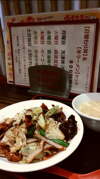東京駅周辺でSuicaを専用端末にタッチするとポイントが溜まるサービスがあるのですが、専用端末が、ちょうどそのお店の隣にありました。そこで溜まったポイントで貰えたお買い物券が、食事に使えるということもあり、このお店に入るきっかけになりました。日替わりランチには、餃子を250円プラスすればつけられるといっても、単品だけでお腹がいっぱいになります。日替わりは木曜日の回鍋肉丼がお薦めです。ホイコーロー丼が勘定書には、なぜか香港丼と表記されています。