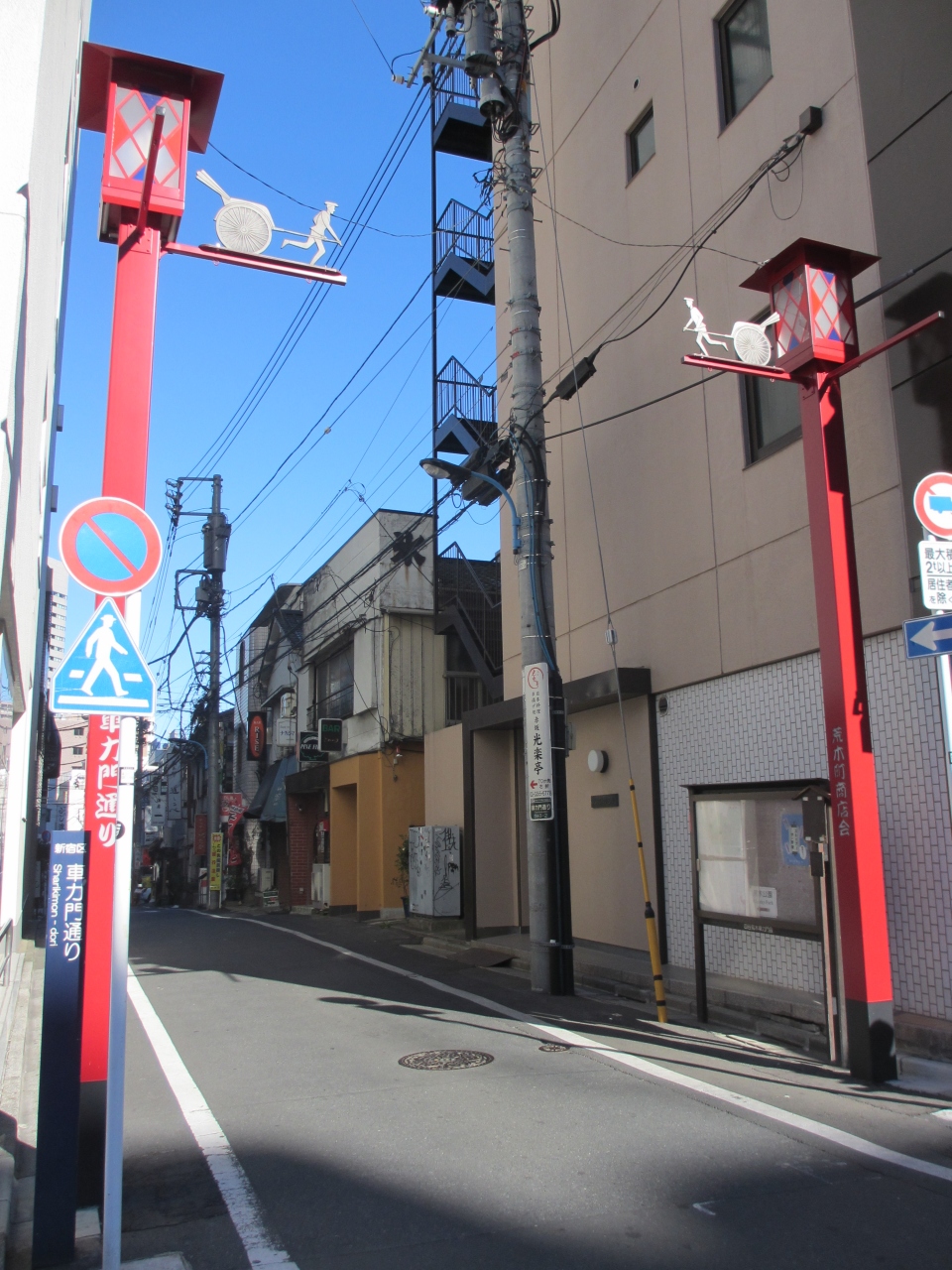 四ツ谷駅から四谷3丁目駅に向かって歩いていくと、新宿通りの北側にあります。通りの入口には赤い柱が立っていて、その上には人力車のオブジェが飾られています。松平摂津守の屋敷に荷車で物資が運ばれたことから名付けられました。通りの両側とその横道にはたくさんの飲み屋と飲食店が立ち並んでいます。昼に通ったため店はほとんどしまっていましたが、日が暮れたころにはにぎやかな通りに変身していると思われます。初めて行くと、どの店に入ったらいいか困ってしまうほど、多くの店が並んでいます。