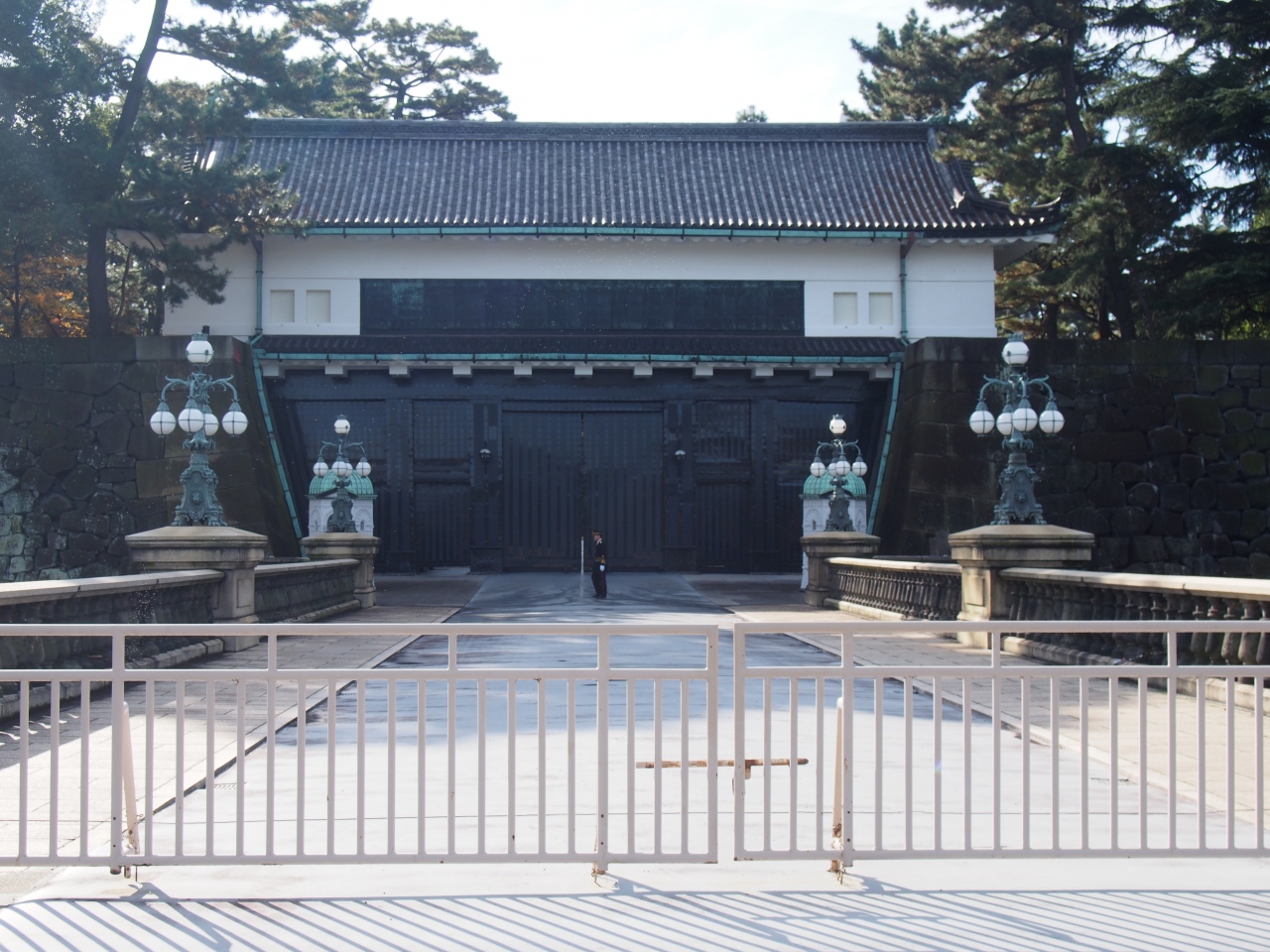 皇居正門付近は皇居の観光のメインスポットで、多くの外国人観光客もいます。この近くには正門石橋、二重橋があり、正門石橋の先には皇居正門があります。正門石橋の手前からは立入り禁止なので、その手前で多くの人が撮影などをしています。正門は立派な門なのですが、特段の装飾などはないようです。