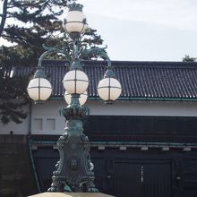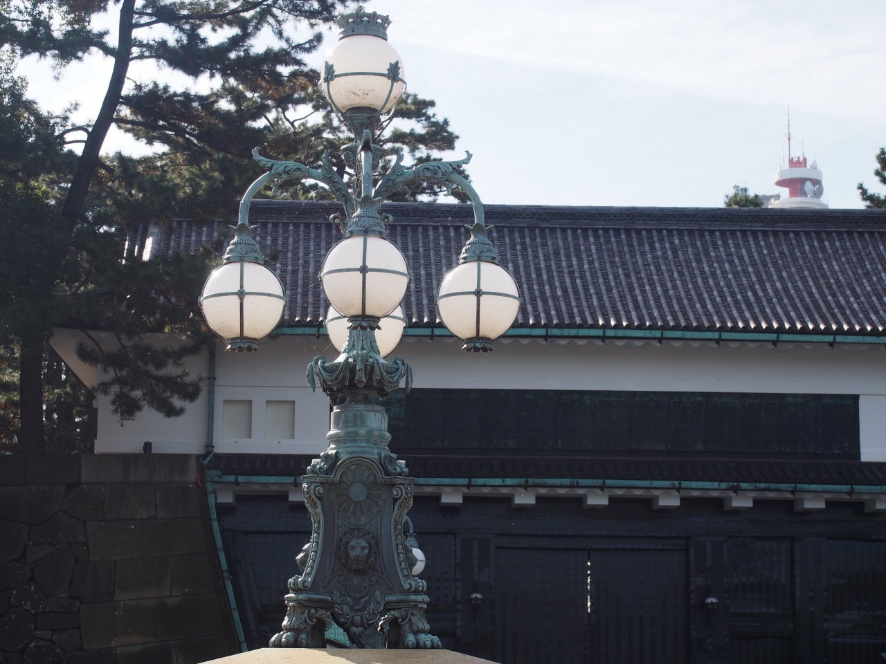 皇居の正門にかかる正門石橋のたもとに美しい装飾の電飾(電灯)があります。石橋はわりとシンプルな造りなので、このような装飾があると橋自体が引き立ちます。電灯にはは5つの電球があり、夜になり明かりがつけられるときれいな感じがします。次回は夜に訪れたいです。
