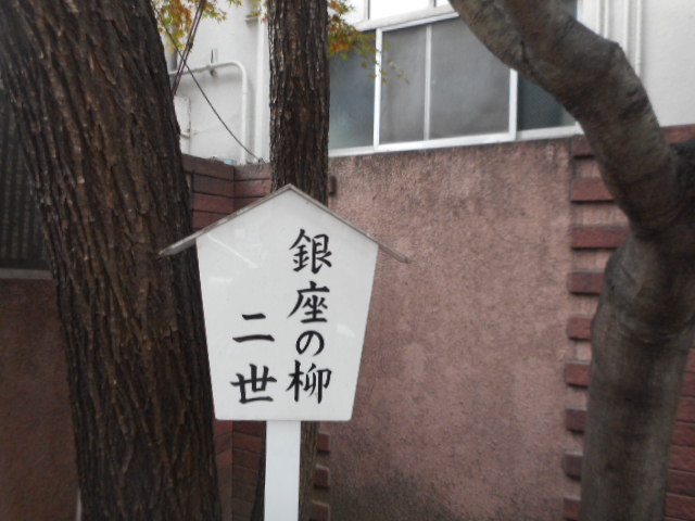 みゆき通りの泰明小学校前に”銀座の柳2世”が植えられています。銀座に愛着が多い中央区の有志がここに植えたそうですが?結構、育って大きくなり、その1本が枝を垂れていました。表示看板が無いと、わかりらないくらいです。