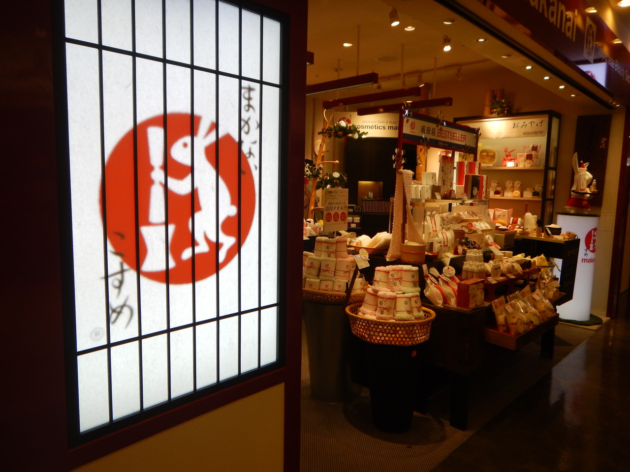 成田空港第一ターミナル4階の専門店街にありました。ウサギが餅つきをしている看板でお馴染みの化粧品や雑貨などのお店です。たしか羽田空港にもあったような記憶があります。和風の自然派化粧品が多く、安くはありませんが、肌には優しそうなイメージがあります。店頭に「こんにゃくスポンジ」があったので見ていたら、洗いごこちを体験させてもらう事が出来ました。一回だけではよくわかりませんが、少しスベスベになったような気がしました。
