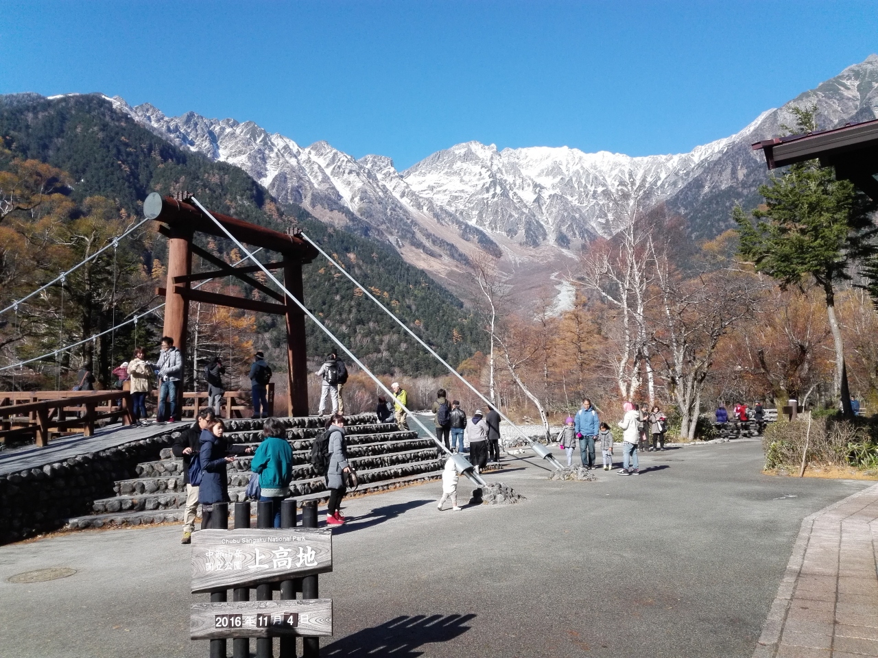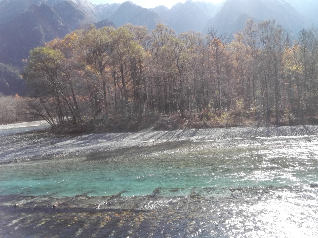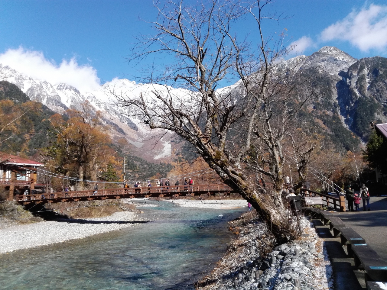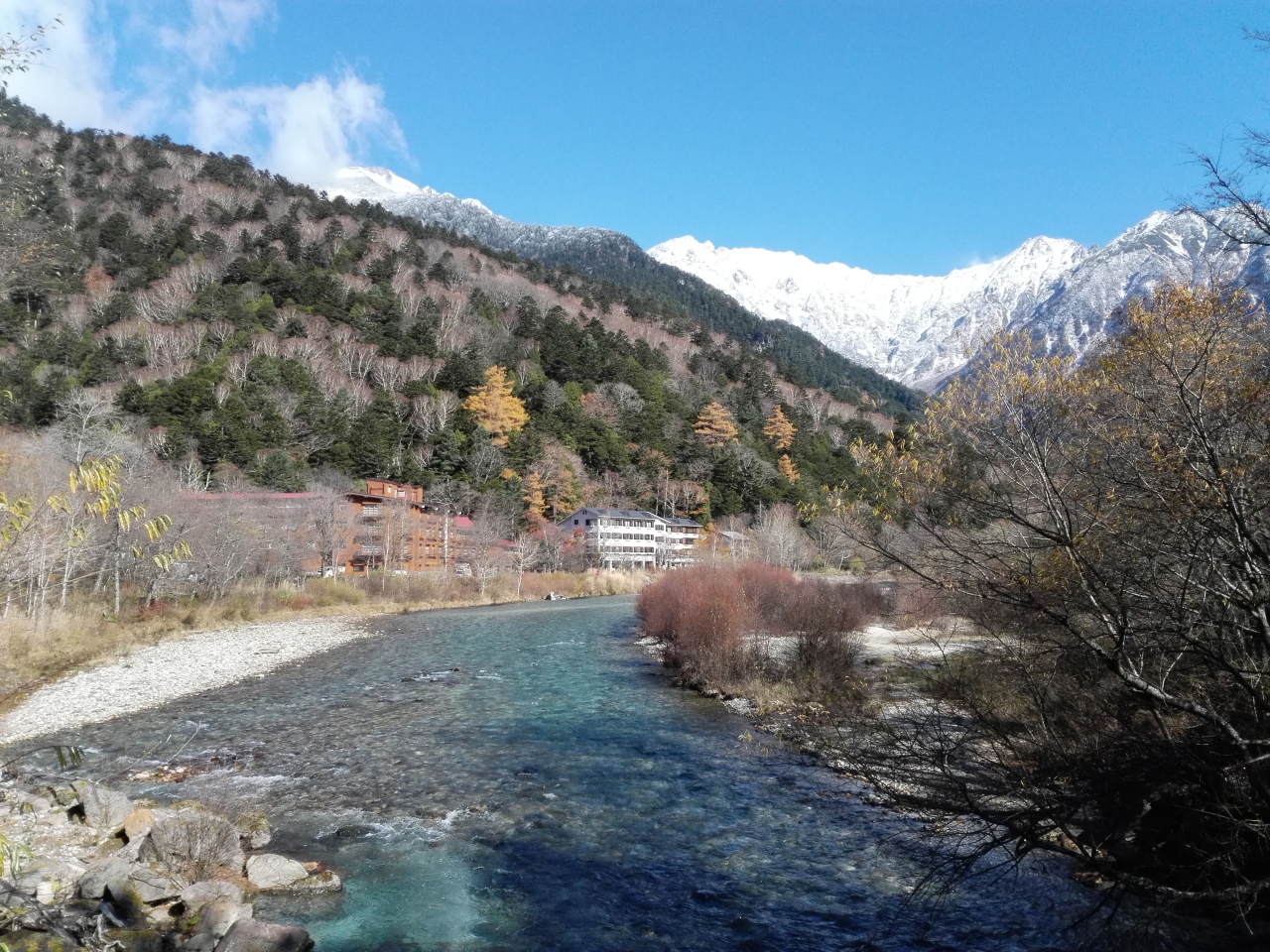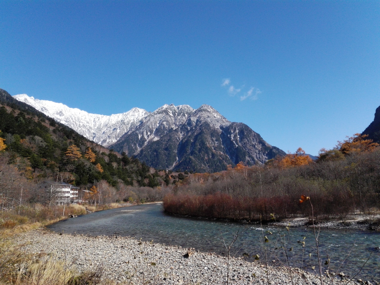 11月の連休に20年ぶりに上高地に行ってきました。快晴に恵まれ、最高のトレッキング日和でした。さわんどからバスに乗り、帝国ホテル前で降り、そこから梓川沿いに明神池まで歩きました。行く途中、焼岳の雄姿や河童橋、穂高連峰を眺めながら紅葉の真っ只中の遊歩道を歩きました。天気に恵まれたので長時間歩いたにもかかわらず、心身ともにすがすがしい最高の一日となりました。
