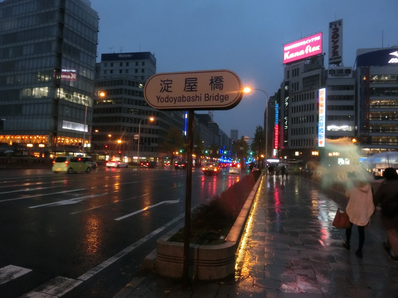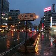中之島の土佐堀川にかかる淀屋橋は御堂筋に組み込まれているから、付近はネオンも賑やか。