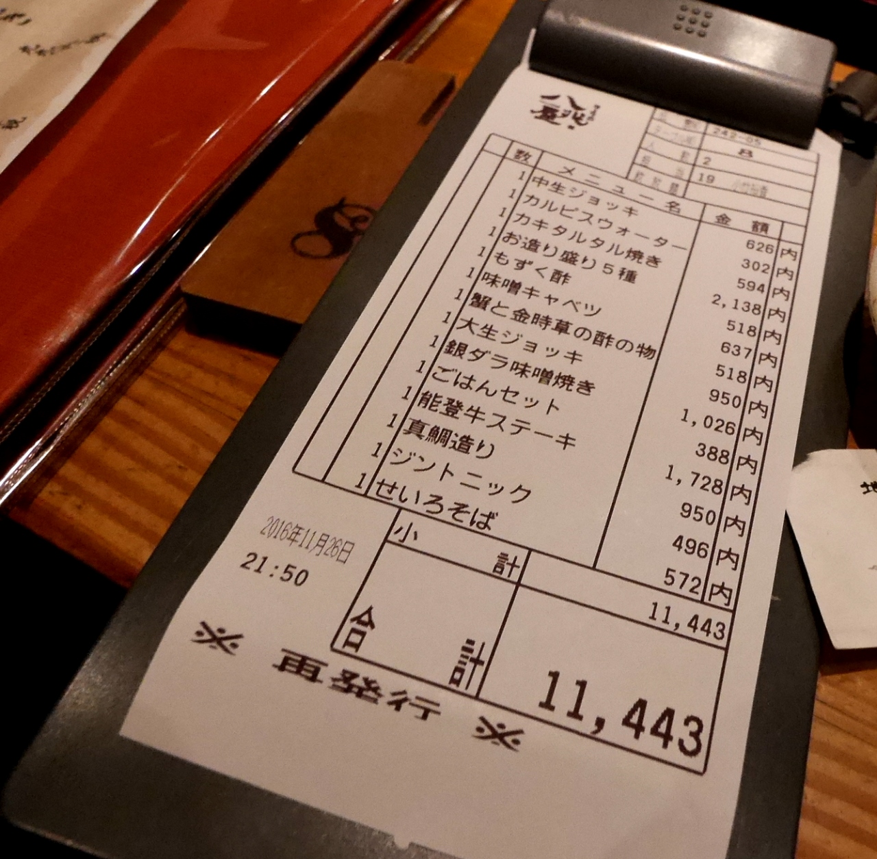 込んでいて約20分弱待たされて,カウンター席に.この店若干値段は高めだが,刺身などは新鮮だった.ステーキも比較的おいしく,それ以外の肴もまあまあだった.この店,カジュアルに駅近くで楽しみたいならいいと思う.予算は6000-7000円だと満足できるか.