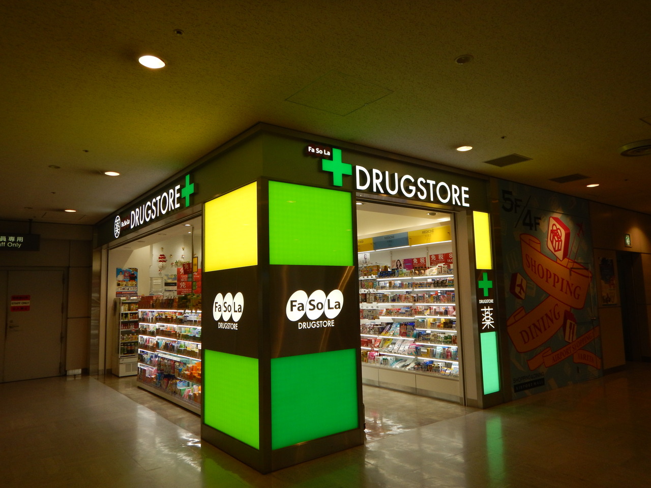 成田空港駅の改札口を出て、真っ直ぐに進むと中央ビルがありますが、そのエレベーターの近くにありました。日本の薬はアジア系外国人にも人気があるらしく、「免税」の文字が店内で目立っていました。薬以外にも普通のドラッグストアと同じようにペットボトルの飲み物とか、キズに貼る絆創膏やシップとか、サプリメントなども置いてありました。入り口が緑色で、遠くからでも見つけやすかったです。