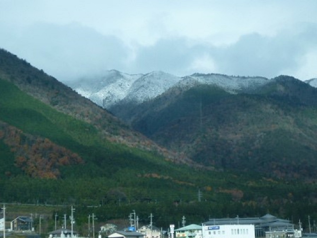 この路線は素晴らしい景色を見ることができます。右には琵琶湖、左には少々積もった雪景色です。