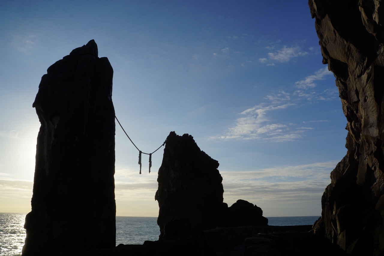鹿岡の夫婦岩は、室戸岬から甲浦の方に向かってしばらく行ったところ。小さなものを想像していたのですが、けっこう手前からいくつかの大きくそびえたつ岩が見えてきて、想像以上のスケール。国道沿いにちょっとした駐車場があって、そこから遊歩道で岩の周囲を巡りましたが、見る角度によって雰囲気も変わるし、かなりのワイルドさ。かなり荒々しい夫婦岩です。