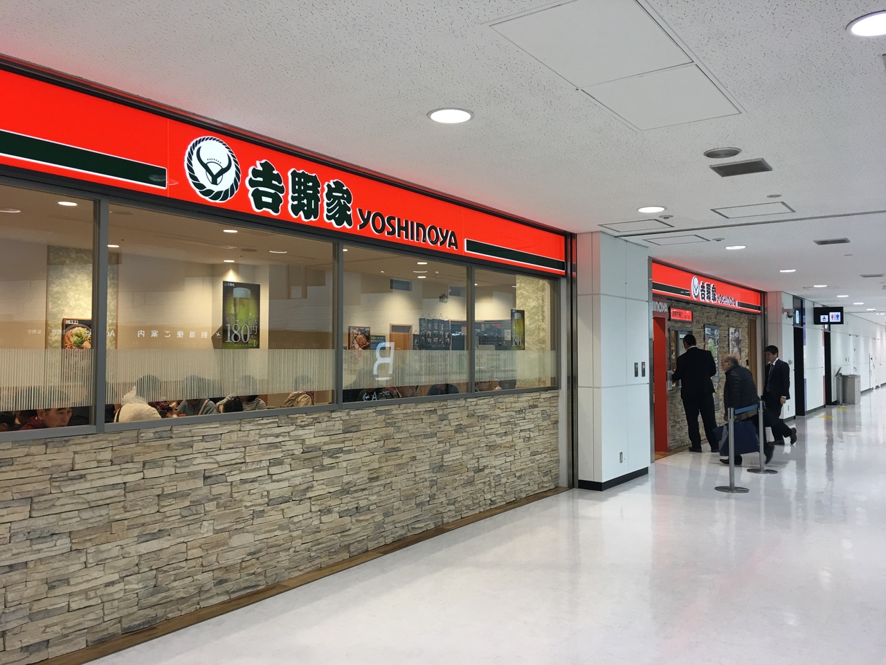 全国展開の牛丼チェーン店で、第2ターミナル到着ロビーの真上に位置します。50名ほど収容できますが、ほぼ空港職員と外国人旅行客で混み合っており、行列が出来る時間もありました。テイクアウトもできて便利でした。