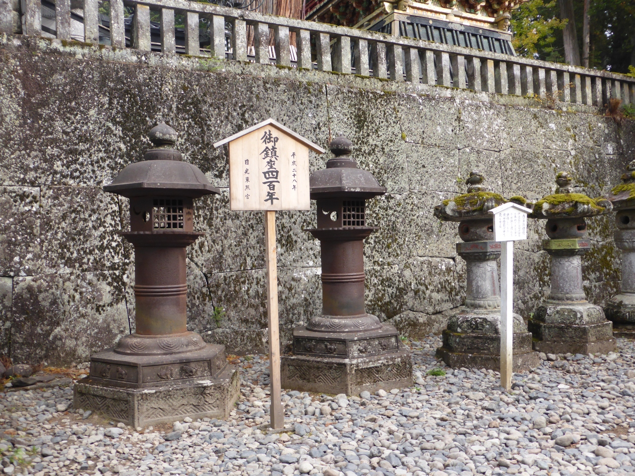 陽明門に上がる階段下の右側にあるのが、南蛮鉄燈籠です。ポルトガルから輸入した鉄を鋳造し、1617年に伊達政宗が奉納したものです。石の燈籠が当たり前だった江戸時代にはかなり珍しいものだったと思われます。今は錆びた色合いになっていますが、これも修復され輝きを取り戻した姿を見てみたいですね。政宗の名前もありますから、探せばすぐわかると思います。