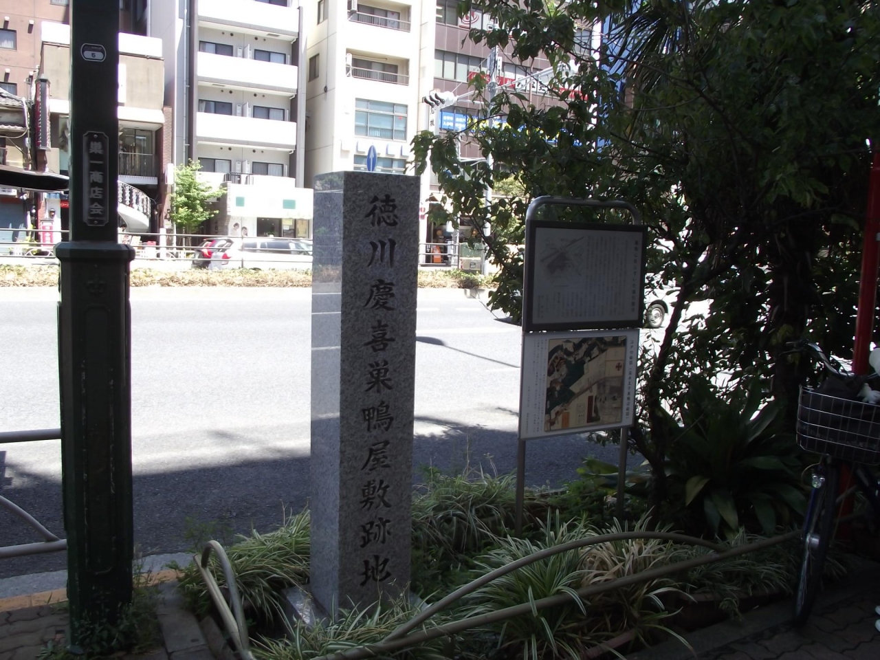 今は、当時の面影は何も見当らず、屋敷の門近くと思われる歩道の車道側の植込みに、「徳川慶喜巣鴨屋敷跡地」 と彫られた石柱と説明板が立ててあるのみです。