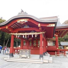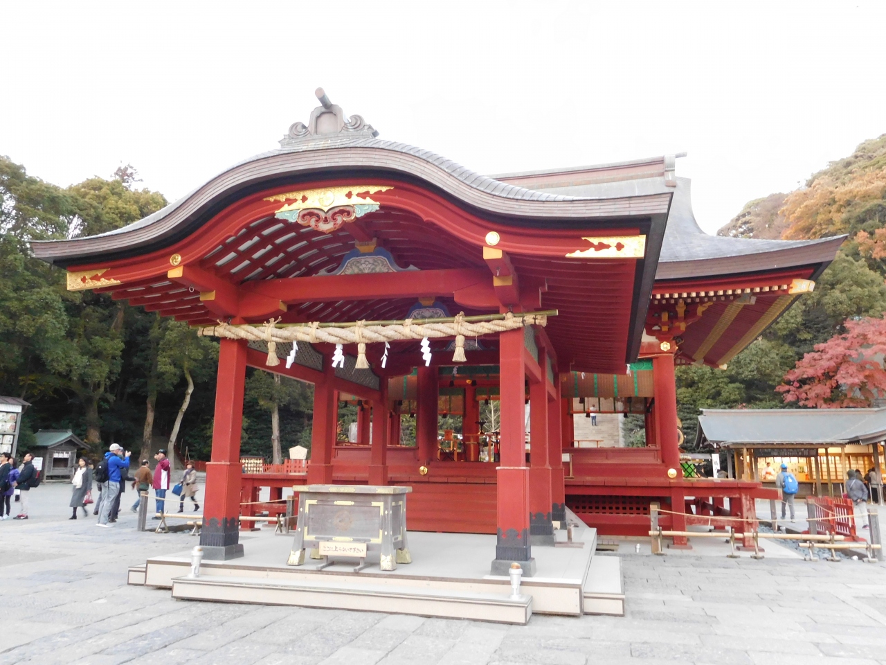 鶴岡八幡宮 境内の中央に位置し、本宮へと続く大石段の下に建つ、鮮やかな朱色が印象的な建物です。別名、「下拝殿」とも呼ばれています。ちょうど結婚式が行われた後のようで、親族の方達が舞殿前で、記念写真を撮っていました。海外から来る観光客は、日本の伝統的な結婚式が見られると、とても興味津々で写真を沢山撮っていました。参拝に来た人が必ず通る場所なので、注目度の高い場所でもあります。