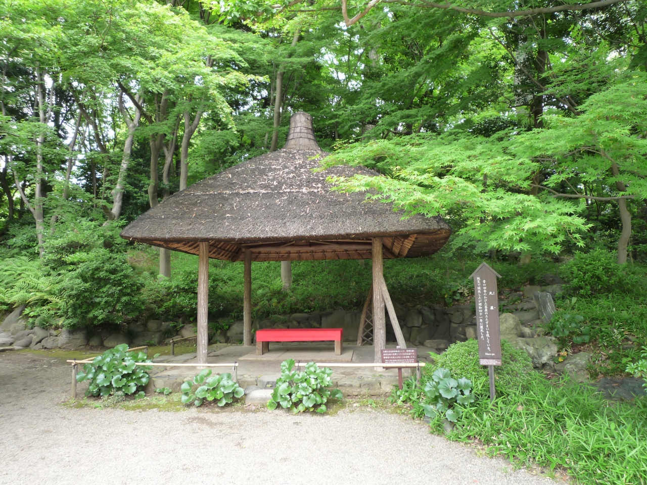 壁はなく四方に柱があるだけですが、周囲の雰囲気と相まって美しい茶屋です。