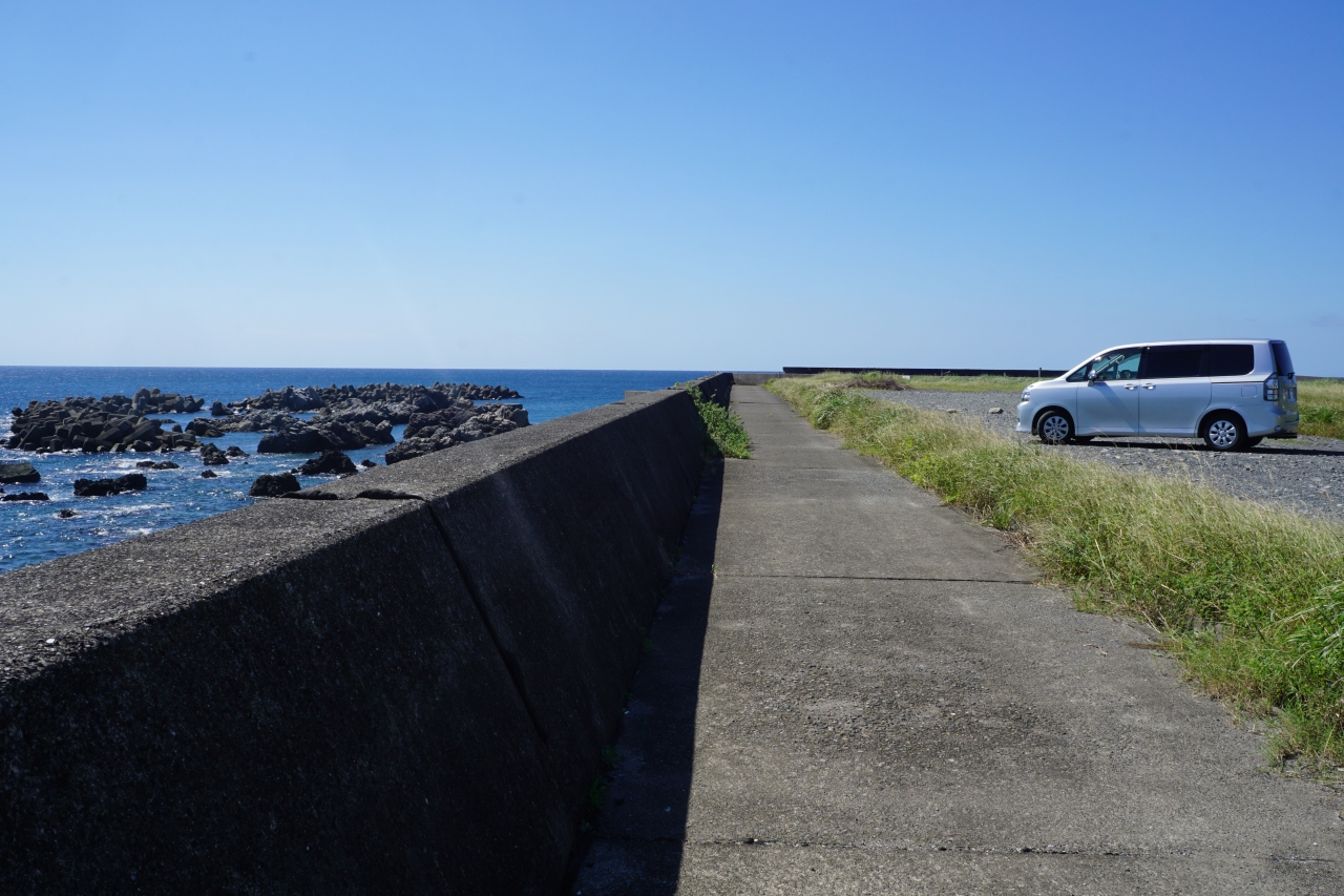 行当岬は、室戸岬の西側。国道に標識があってすぐ分かります。ただ、入った先は広い空地か工事現場のような草原。それに、堤防があるので海の眺めもあんまりよくない。行当岬というのはそれらしい名前ですが、見どころは何もないように思います。