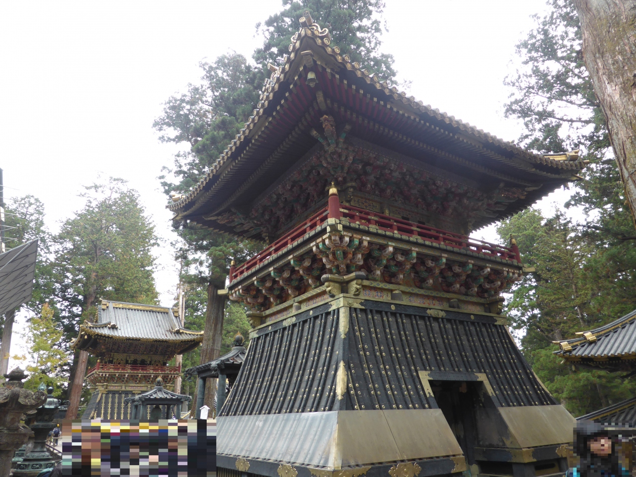 陽明門に向かって左側にあるのが鼓楼です。鼓楼には太鼓が収納されています。鐘楼と鼓楼はそれぞれ単体で設置される事もあるようですが、東照宮では一対。鳴き龍のある本地堂の前でもあり人が多くゆっくり見る事はできませんでしたが、櫓の作りが見事でここにも霊獣の彫刻がいくつかありました。