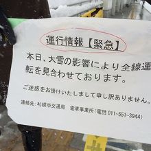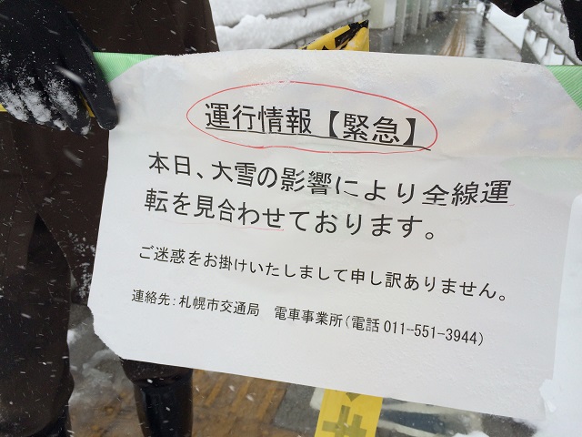 すると係りの方が立っていて、この日は始発から大雪の為に運休しているとのことでした。