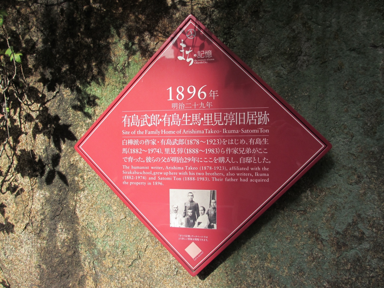 上智大学の向かいから大妻女子大学までの道路が番町文人通りです。名の由来となった作家たちが以前多く住んでいた通りです。大きなマンションベルテ六番町の石垣にプレートがあります。有島武郎兄弟がこの辺りで育ったそうです。千代田区が造ったプレートまちの記憶があちらこちらにあります。文人通りにも幾つかあるので、キョロキョロしながらプレート探しを楽しみました。高級マンションやビルが建ち並ぶ番町をプレート探しながら歩いてみてはいかがでしょうか。楽しいです。