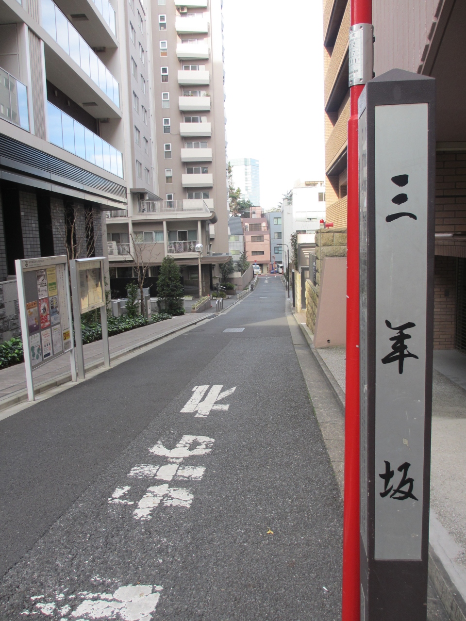 市ヶ谷駅から半蔵門駅の一帯は坂道が多いです。名前が付いていてほとんどの坂に名前の由来が書いてある柱が歩道に建っています。三年坂はソニーミュージックの前から市ヶ谷駅へ下るゆるやかな坂です。並行する他の坂と比べて車の通りが少ないので安心して歩けます。四谷・市ヶ谷・半蔵門がどのような地形にある駅なのか、坂の名の由来は何か、江戸時代この辺りはどのような役割だったのかなどを、あちらこちらに立っている説明板を読みながらイメージをふくらますことができます。江戸を知る散歩ができます。