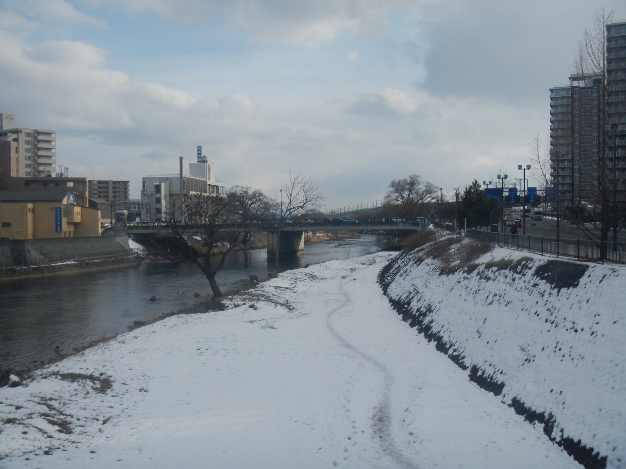 盛岡駅に降りて開運橋を渡る時に北上川を見る。盛岡城跡公園、啄木新婚の家に寄って、再び盛岡駅に戻る途中で夕顔橋を渡る時にまた北上川を見た。この時は晴れ間があり、岩手山が山頂の一部を除き、見えたのでとてもよかった。