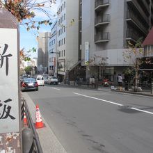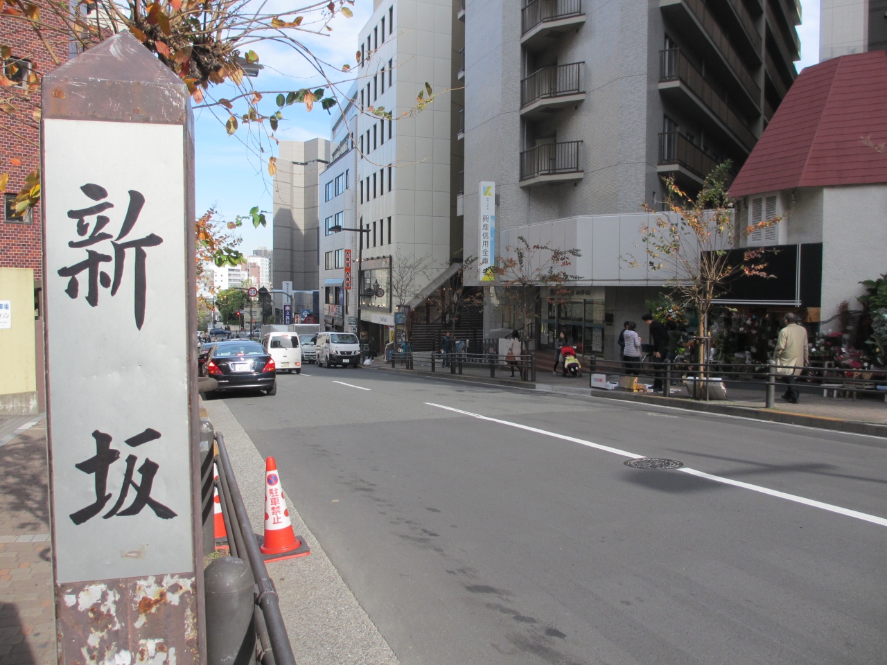市ヶ谷駅へ続く日テレ通りの坂です。半蔵門駅と市ヶ谷駅の一帯は坂が多いです。坂の名の由来が記された柱が立っている坂も多いです。新坂を車が多く通り、歩道を歩く人が多いのも市ヶ谷駅に向かう道だからでしょう。坂の両側にはビルが建ち並び、道に面して飲食店や信用金庫などがあるためか路上駐車の車が目立ちます。番町にある坂の名の由来を見たり、あちらこちらにある説明板で江戸時代の町の役割を知ったり、歩きながら歴史を知ることができる町です。