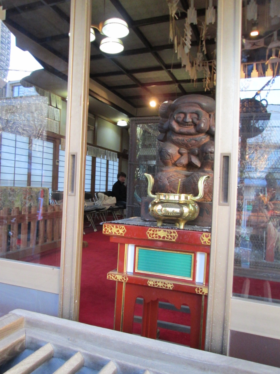 氷川神社より徒歩8分で大法寺に到着。江戸時代少し前創建の日蓮宗寺院です。本堂の中に「三神具足大黒天」と呼ばれる大黒天が祀られています。三神具足というのは弁財天の優しい顔、毘沙門天の持つ鎧、大黒天のもつ小槌を併せ持っているところから付いた名です。大黒天はインド出身の神様で、健康増進の神様です。この大黒様を拝むことにより3つのご利益があることになります。ここも住宅街にあるせいか、都会の中にしては静寂さを感じました。御朱印を頂きました
