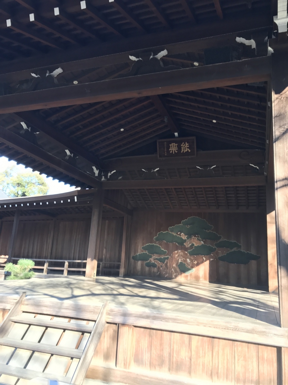 靖国神社の本殿近くにある、能楽堂です。明治14年に東京は芝公園に建てられもので、明治36年に靖国神社に奉納、移築されました。この舞台では、神霊を慰めるための能や日本舞踊などの芸能が行なわれる神聖な舞台です。