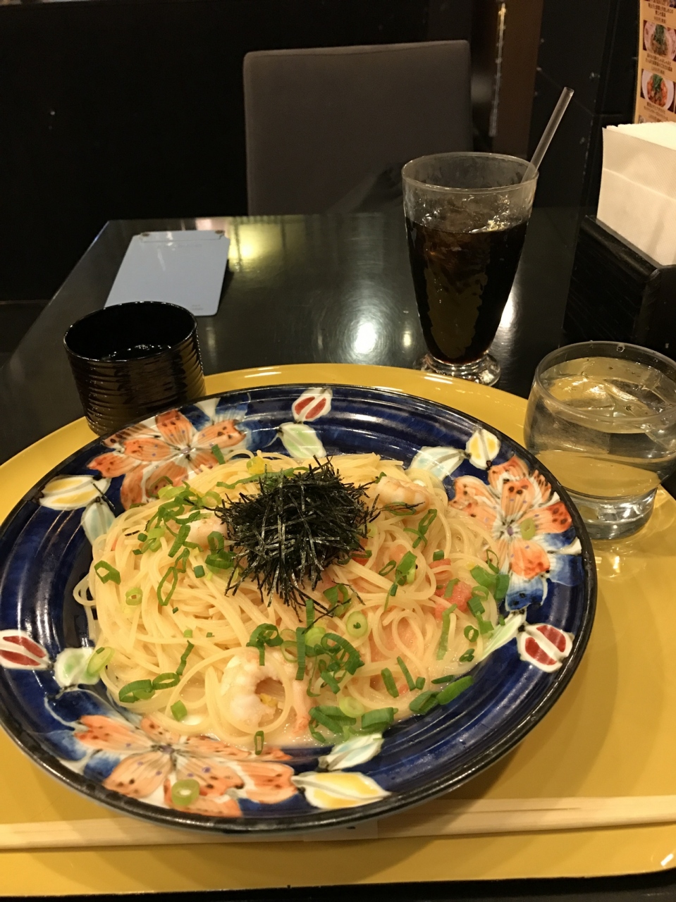 タラコバターのパスタとアイスコーヒーで、税込972円です。