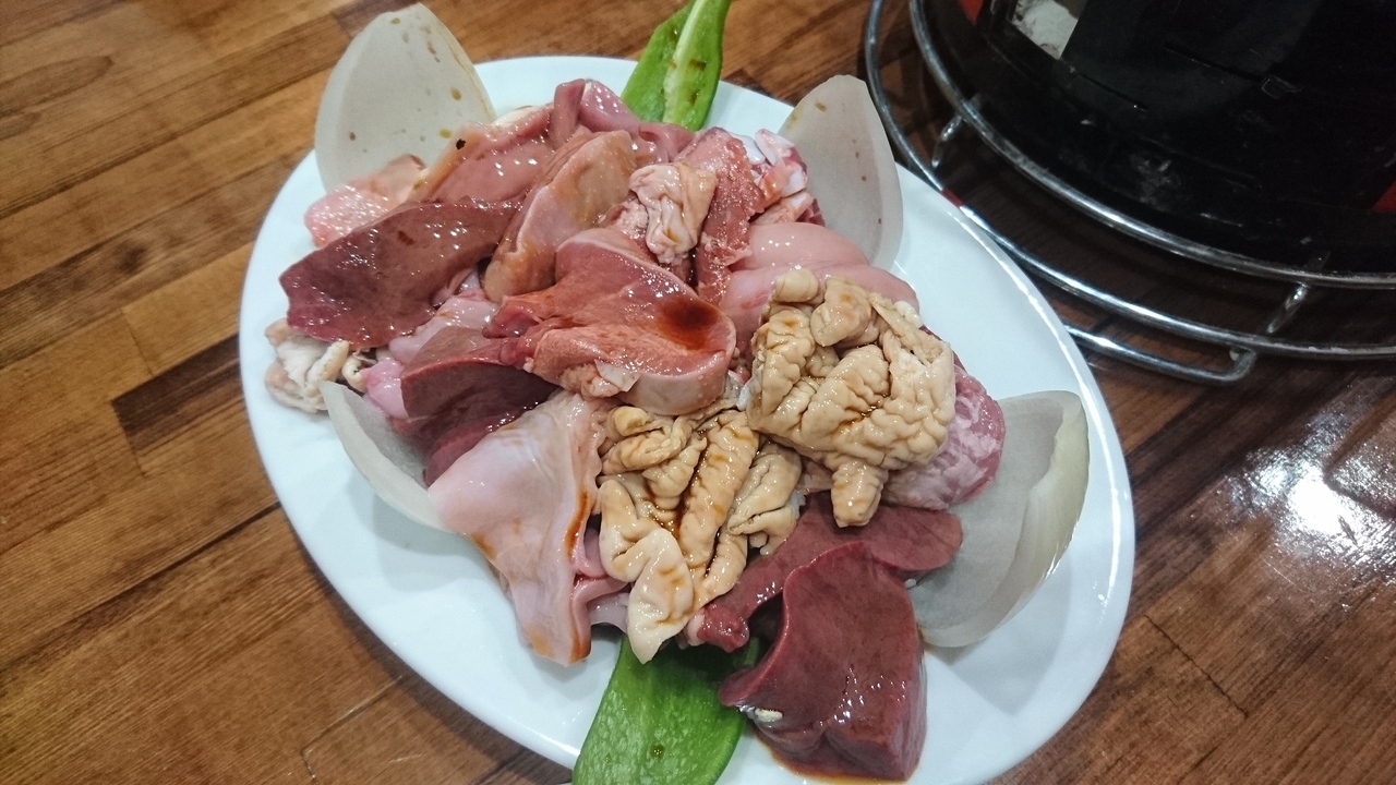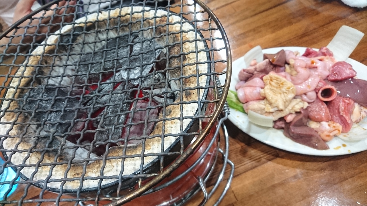 七輪で焼くので煙くなりますが、あつあつのホルモンを味噌につけて食べるととってもおいしい!
