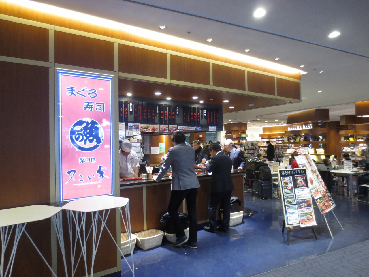 第一ターミナル制限区域内、キャプテンズトーキョーにあるお寿司屋さんです。立ち食いで且つ短時間で食べれますが、ちゃんと板前さんが握ってくれるし、ネタの鮮度も良くて、本格的なお寿司です。その分値段も高め。単品でどんどん頼んでると、けっこうな値段になってしまいます。個人的には搭乗前にお寿司を少々って感じで利用しています。しっかり食べたいならお得なセットがおすすめです。