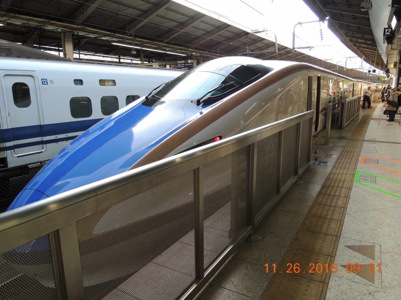 普通車はえんじ色の座席で横3席2席ですが、11号車のグリーン車はブルー色の座席が横2席2席で前後もゆったりとして乗り心地よかったです。12号車は1両だけグランクラスで横が2席1席で、食事や飲み物もサーブされ飛行機のビジネスクラスといった感じだそうです。