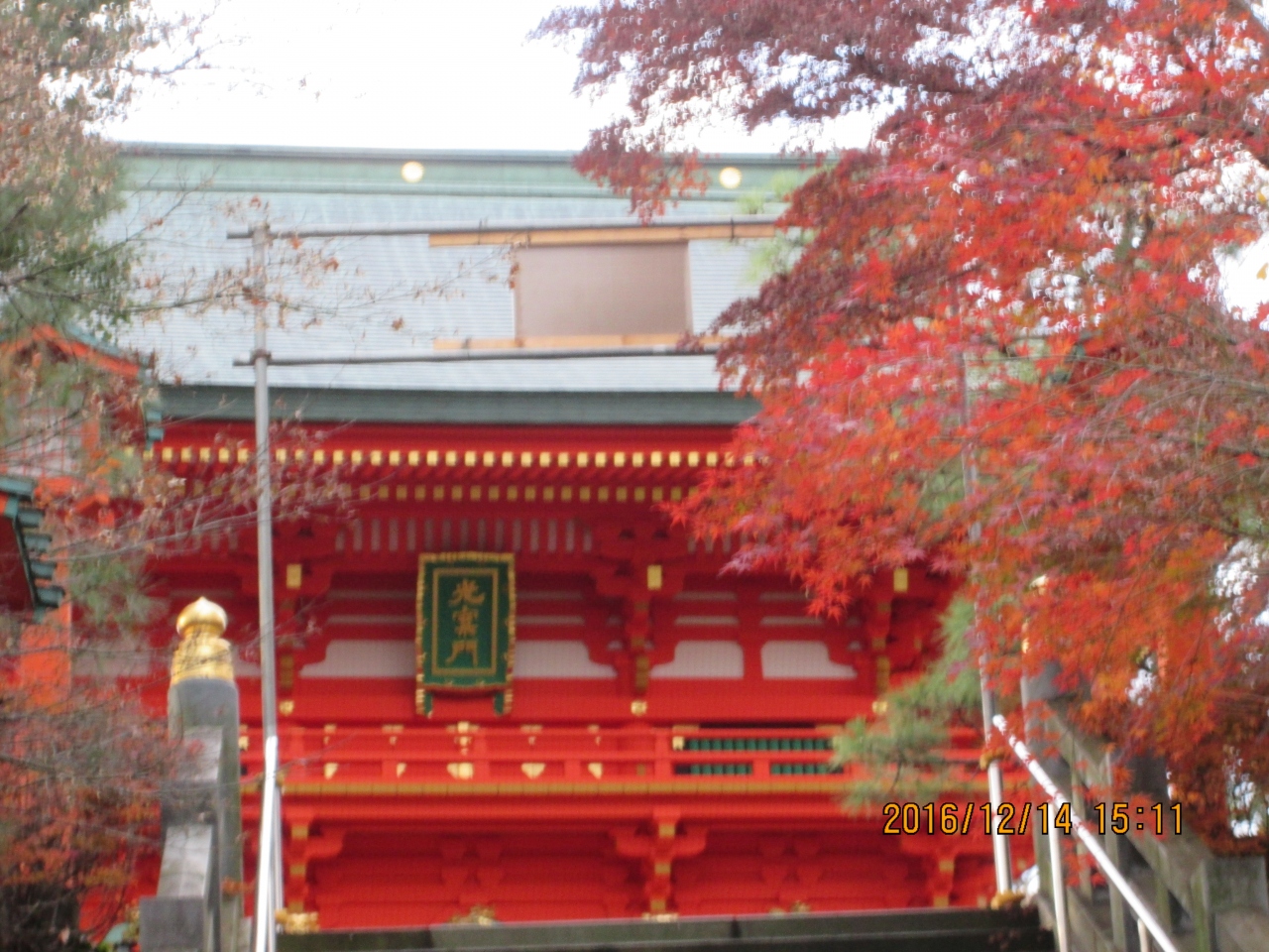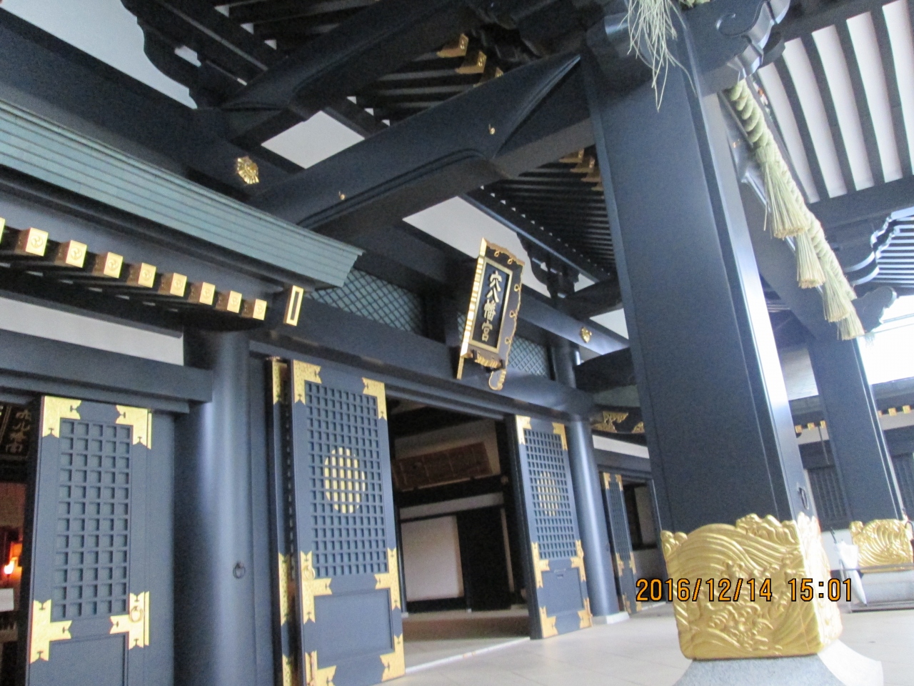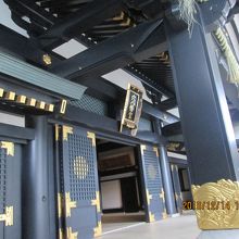 赤い随神門と金色で飾られた黒い拝殿の対比がとても美しい神社です。