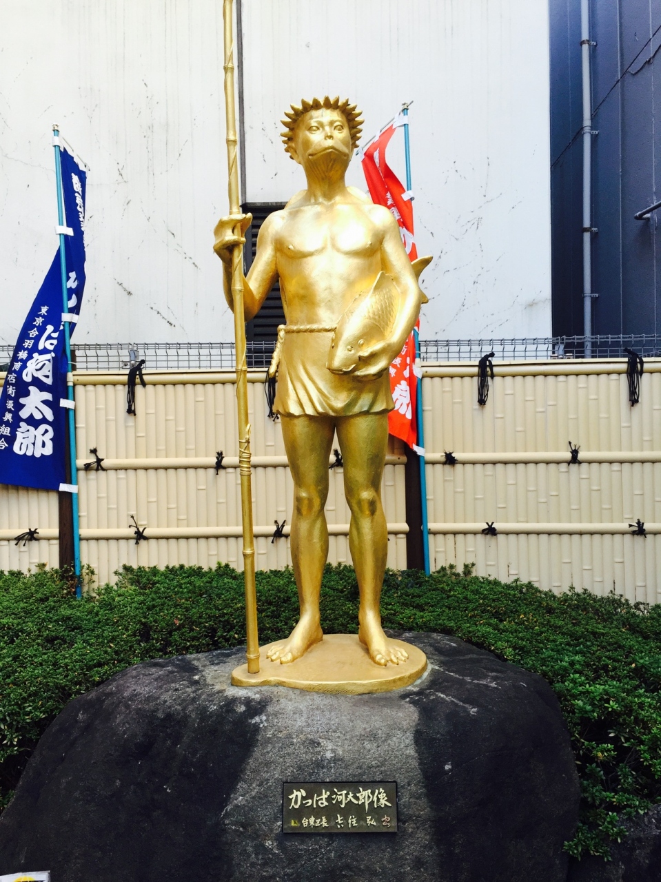 合羽橋から浅草方面に歩いていると突如、きんぴかりんの河童が現れます。「かっぱ橋道具街」誕生90周年を記念して、東京合羽橋商店街振興組合によって2003年に建てられたそうです。商売繁盛祈願に来る方もいるとか。