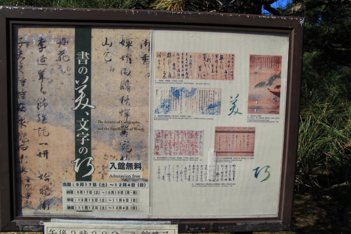 皇居東御苑の紅葉を見に行ったついでに立ち寄りました。「書の美、文字の巧」展が開催されていました。貴重な資料が展示されていましたが、絵画と違い地味な感じでした。