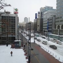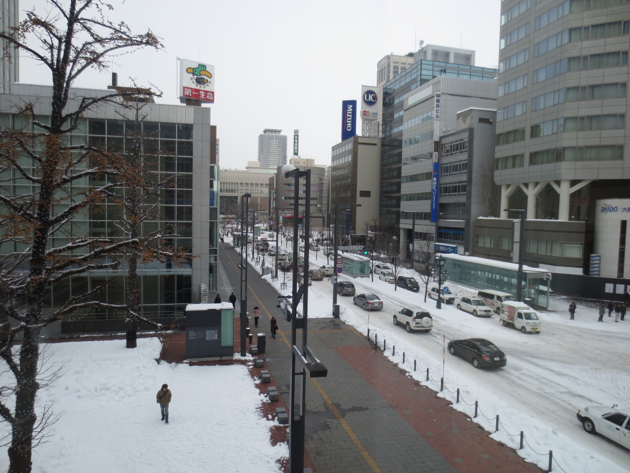 冬の札幌。札幌駅前通は大雪が降ったせいで、雪道になってました。でも歩道は雪がないので歩きやすかったです。これってもしかして、ロードヒーティングでしょうか。きれいさっぱり、歩道だけ見事に雪がありませんでした。さてこの通り、駅前からすすきの方向まで一直線のメインストリートです。途中、大通公園とクロスし、その先がススキノ。夜はイルミネーションもやってました。