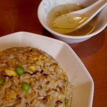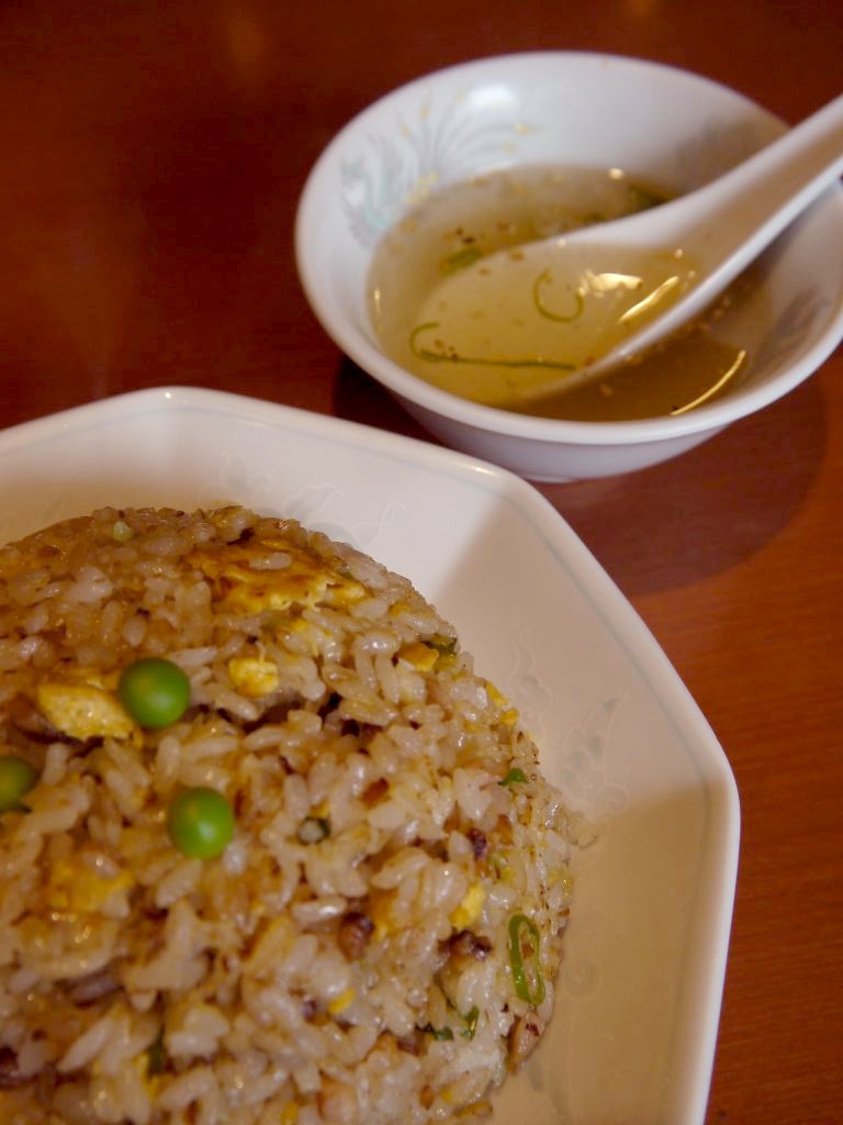 醤油で味付けされた、昔ながらのもの。グリーンピース、玉子、タマネギが散見する。