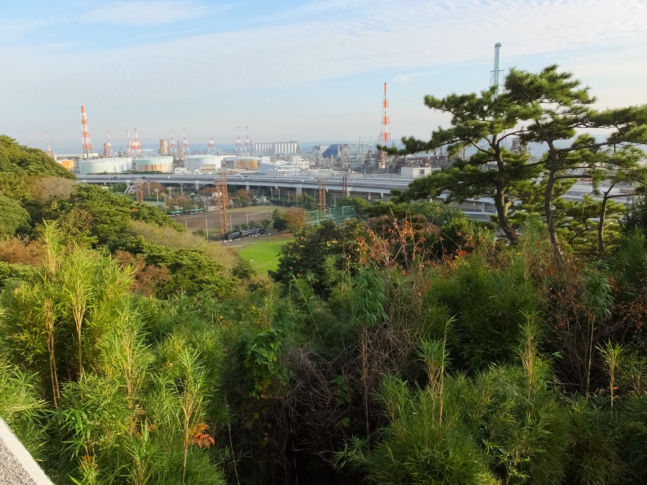 横浜の三渓園の中の展望台。展望台といえば普通は絶景、なのでしょうが、ここは園内の自然とは正反対の横浜の工場の群れと高速道路。まあ、現実との接点ともいうべき場所です。