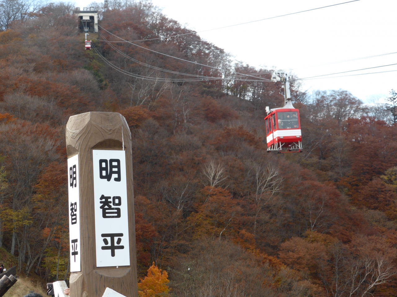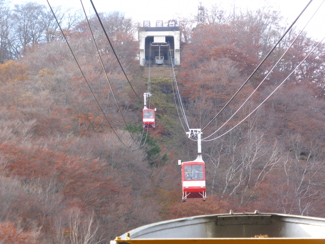 明智平から展望台までを結ぶロープウェイです。明智平駅は1274メートル、展望台駅は1373メートルで、標高差99メートル、乗車時間は3分です。紅葉の時期は行列するそうですが、訪問した時は中禅寺湖の紅葉が終わってすぐの平日なので、待ち時間なく乗れました。