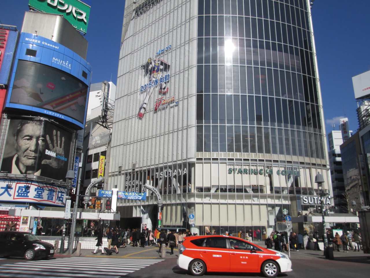 渋谷駅前のスクランブル交差点で青信号になるのを待っていると、正面に見える建物です。広告の発信ビルのようで、2015年に開始する国民的アニメの新シリーズの宣伝を行っていました。不思議な光景でしたが、建物の壁に目を引くアニメーションが映し出されていました。