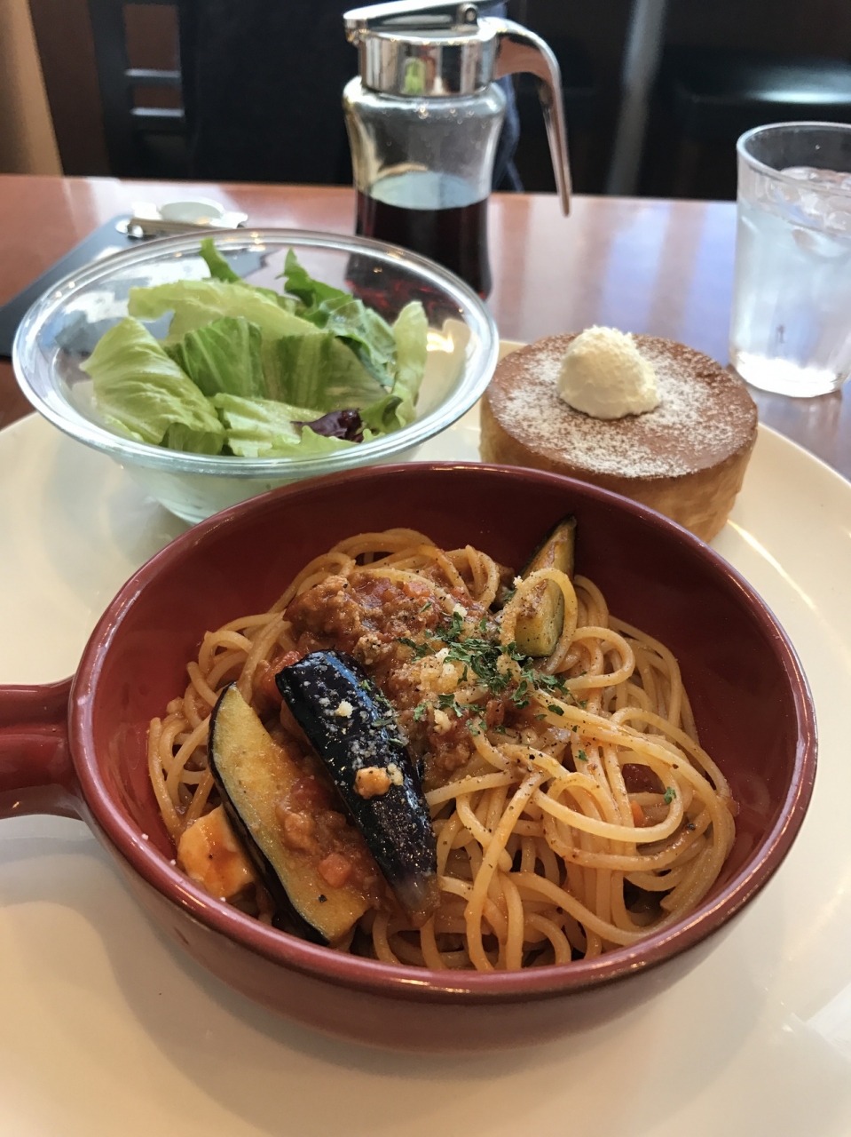 前から気になっていた、パンケーキが食べられるカフェ。ランチメニューでもパンケーキが食べられます。本日はサラダに茄子のボロネーゼとパンケーキのプレートが1000円です。200円引きでドリンクも付けられます。