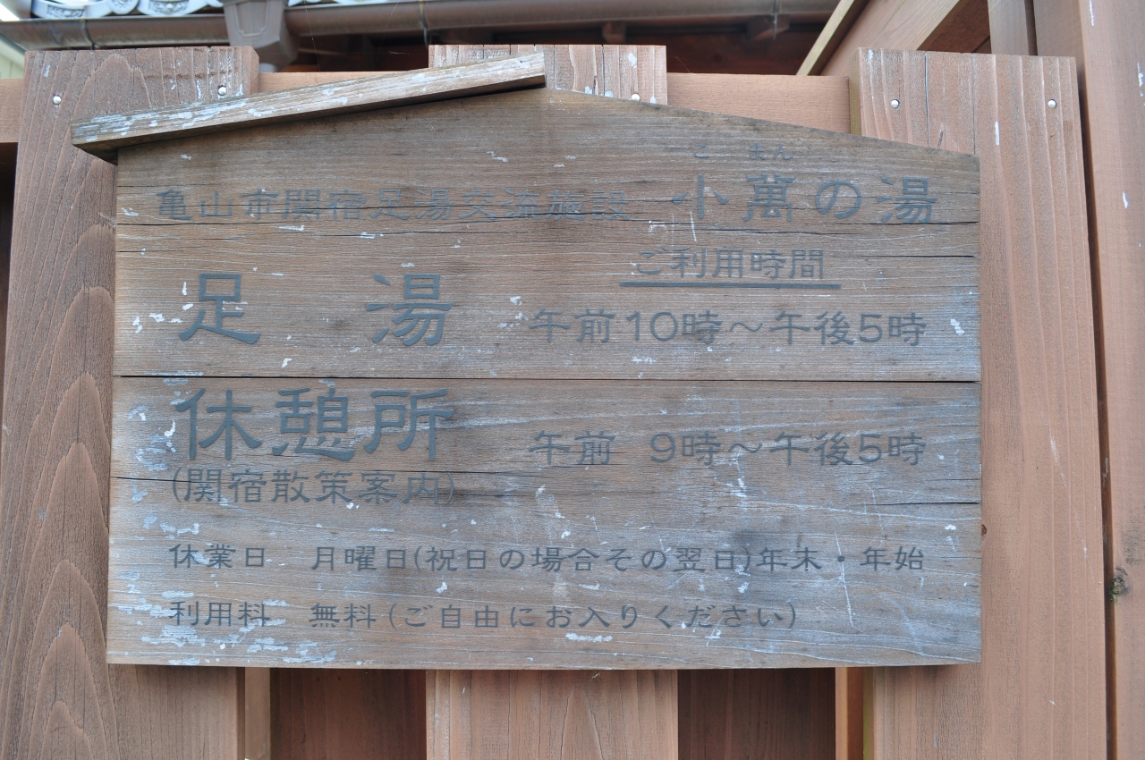 2016年5月に訪問。社員旅行で亀山市関宿を訪問した際に、観光バスの駐車場の脇に「小萬の湯」がありました。午前10時~午後5時までの営業で、無料で利用ができるとの事です。ツアー旅行のため、時間がなくて利用することはできませんでしたが、地元の方らしき人たちが利用されていました。関宿の中心通りから離れた場所にあるので、ちょっと見つけにくいかもしれません。