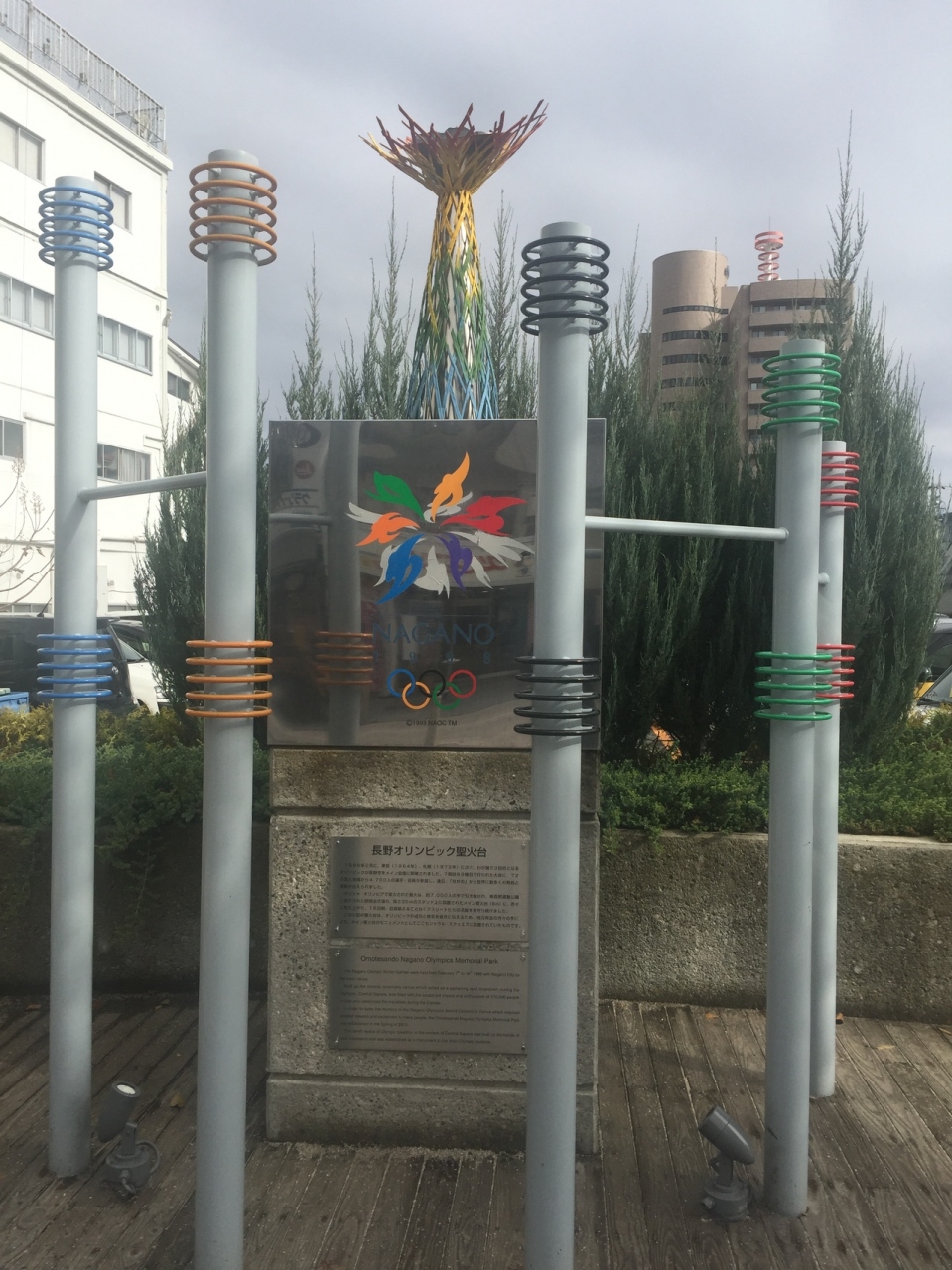 善光寺の表参道という伝統的な景観の場所なので、オリンピックカラーは少し雰囲気が異なりますが、それもご愛嬌です。