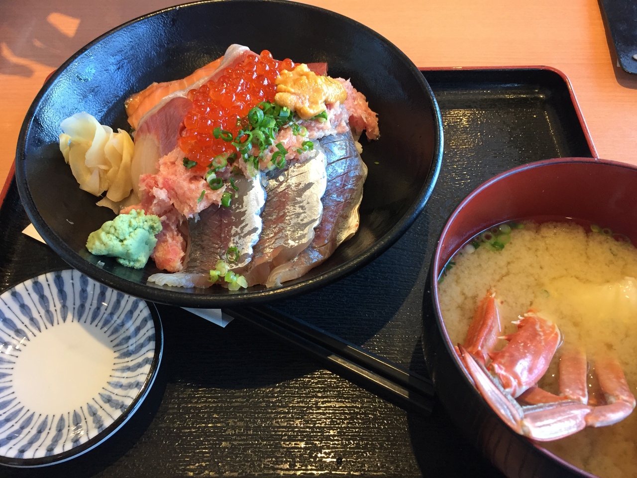 伊東でサクッと美味しい海鮮丼をいただけます。マリンタウン内なので駐車場も広く便利です。入り口は狭く見えますが、店内は意外と広く、海を見ながら食事ができます。定食の汁物に200円追加したカニ汁も美味しかったです。
