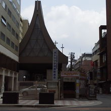 細長く突き上げた、むくりのある屋根が特徴的な教会です。