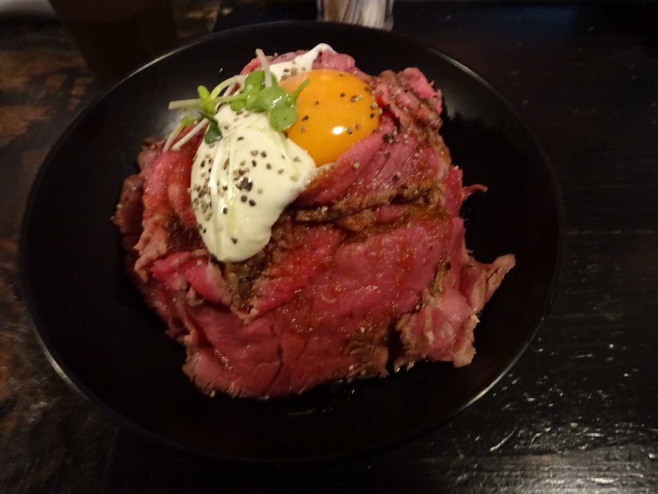 ローストビーフ丼をオーダーすると、ほんの数分で出てきました。ご飯がローストビーフで覆われ、甘めのたれがかかっていました。肉も柔らかめでした。