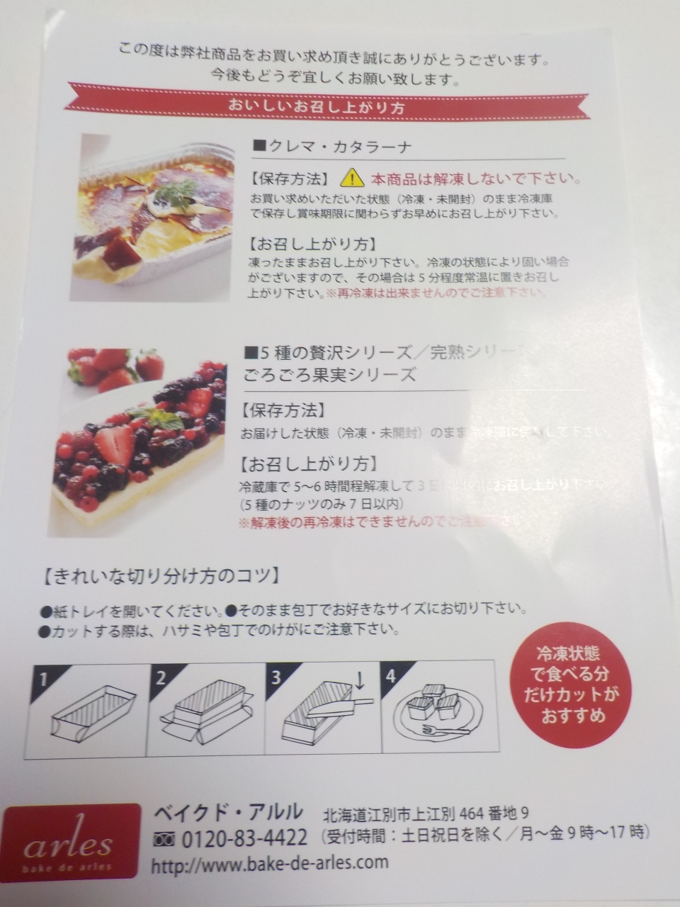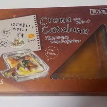 お店の一番人気とあった「クレマ・カタラーナ」。冷凍したプリンに、ブリュレされたカラメルが乗っています。試食して美味しかったので購入しました。保存は冷凍で食べる分だけカットします。うちは家族でぺろりと全部平らげました。