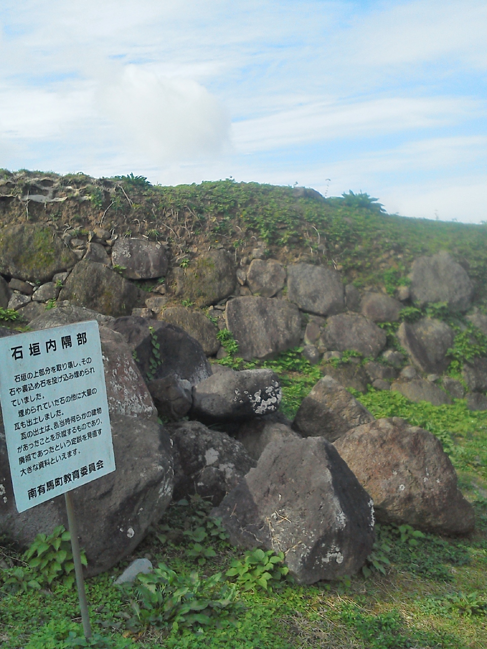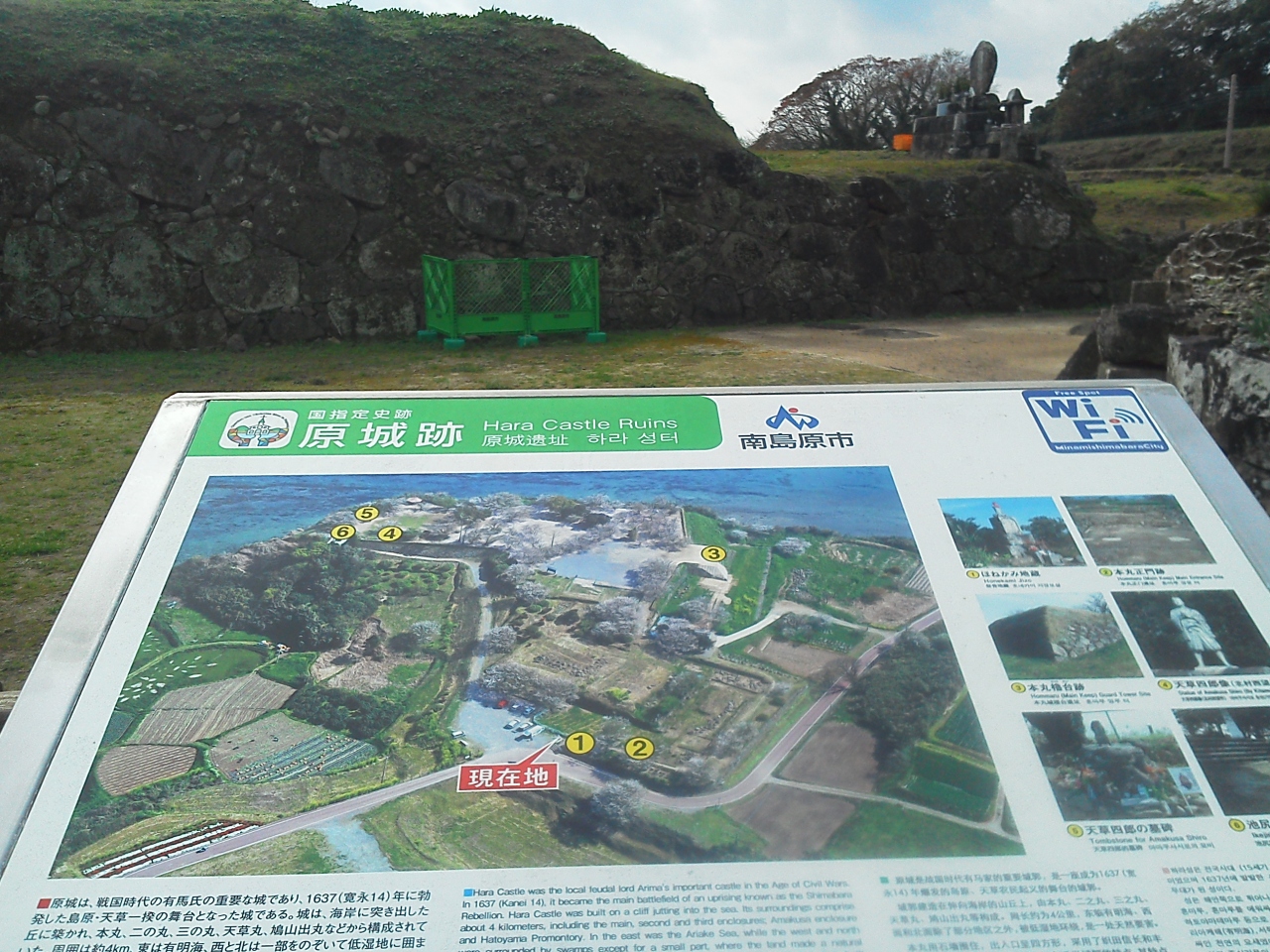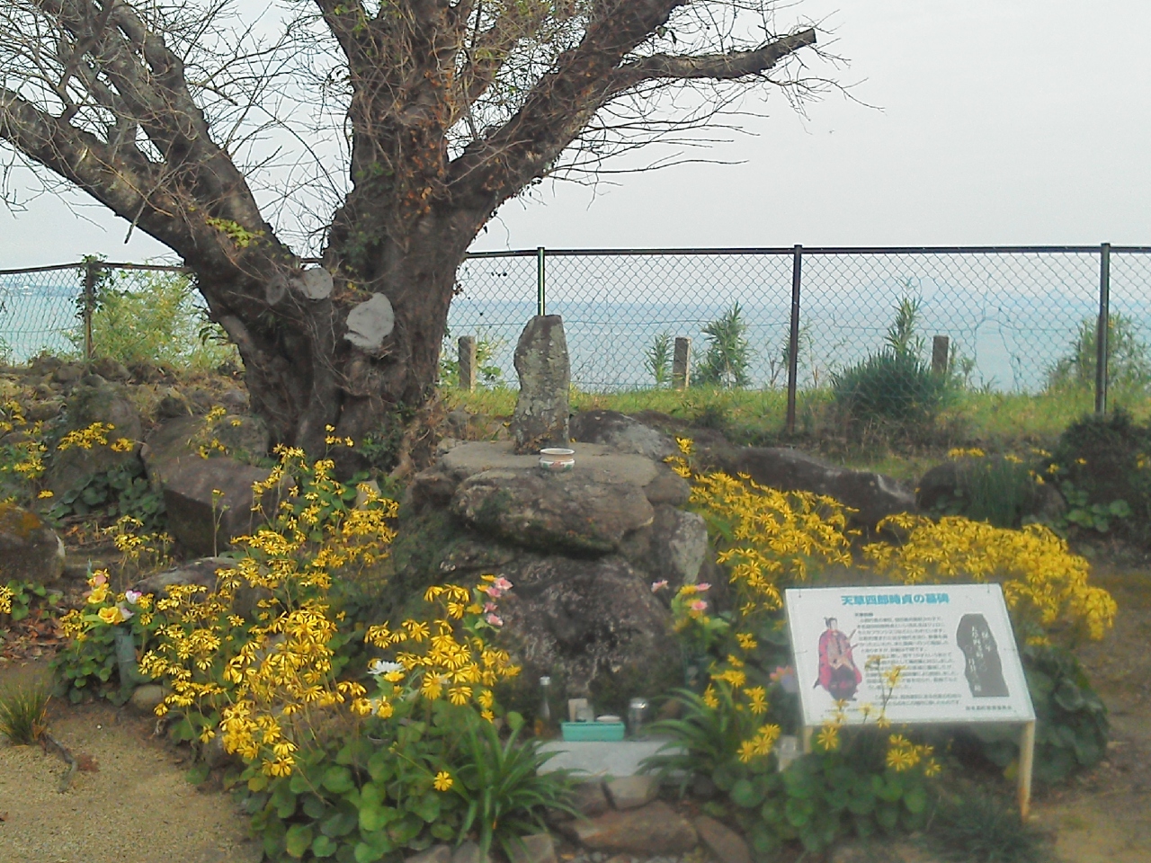 12月の晴天に「原城跡 」を訪れました(他の訪問者がいませんでした)。僅かに城跡が残っていますが(お城ではなく)小高い丘に`十字架`があって、天草四郎の墓/立像/キリシタン墓々等が祀られています。特に`天草四郎の墓`は、島原湾を背景に、小さな石のお墓で(暮石ではないですョ)、守るように木と花が植えてありました。(ごれから予定では島原城を目指しますが) 複雑な思いでした…同時、両方の間を行き来していた方のお墓もあったのでお辞儀を。。