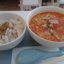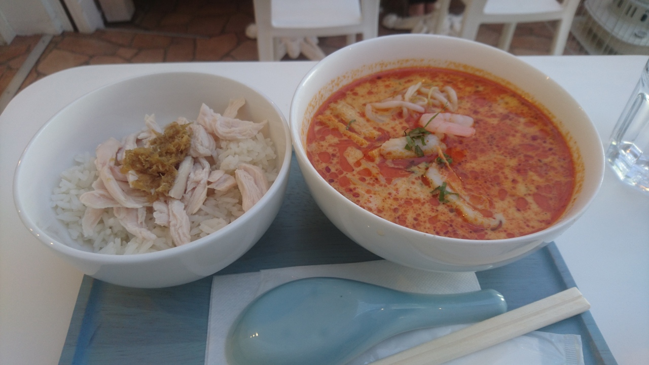 ラクサは普通の麺、手打ちの短い麺、ミックスが選べます。またシンガポールチキンライスをセットでつけることもできます。