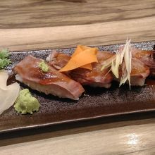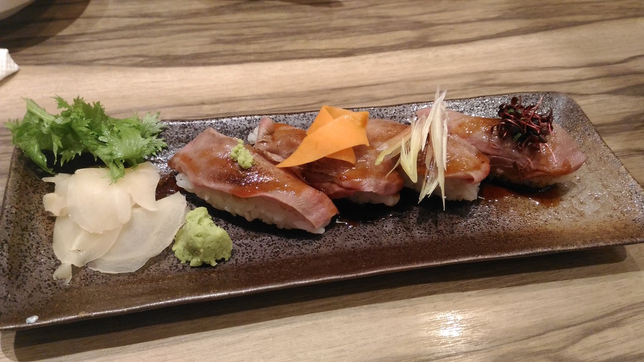 土日のお昼時は11時前に入ると待たずに行けると思います。牛タン炙り握り1200円。少し値が張りますが、トロトロで美味しい。これだけだとお腹がふくれないので、単品のテールスープを注文。300円ちょっとでした。