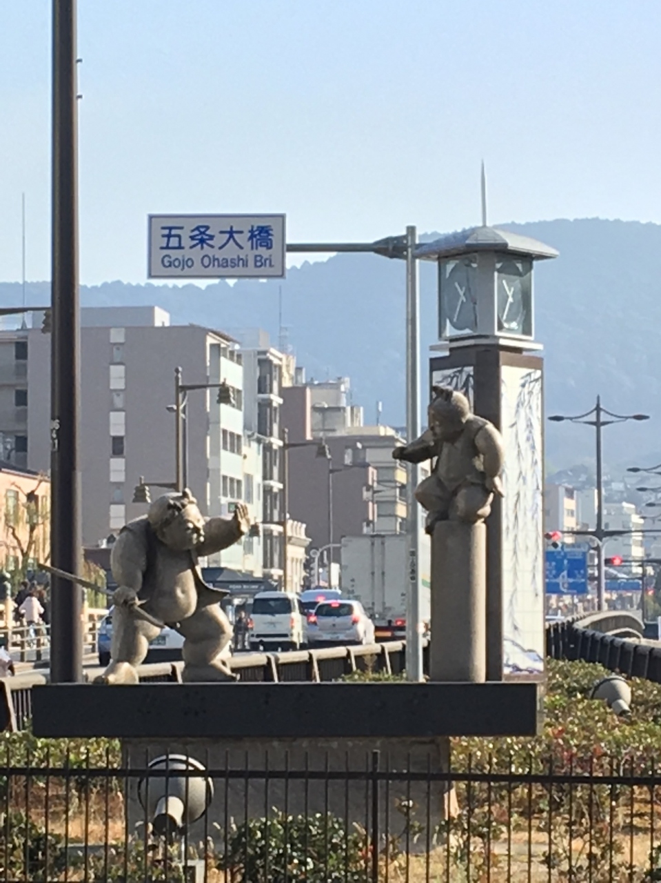 弁慶と牛若丸が勝負をしている姿の像があります。五条大橋の西詰から少し西に行った五条通の中央分離帯の中です。五条通と河原町通の交差点のすぐ西側です。横断歩道の中程から写真が撮れますが、交通量の多いところなので、注意が必要です。